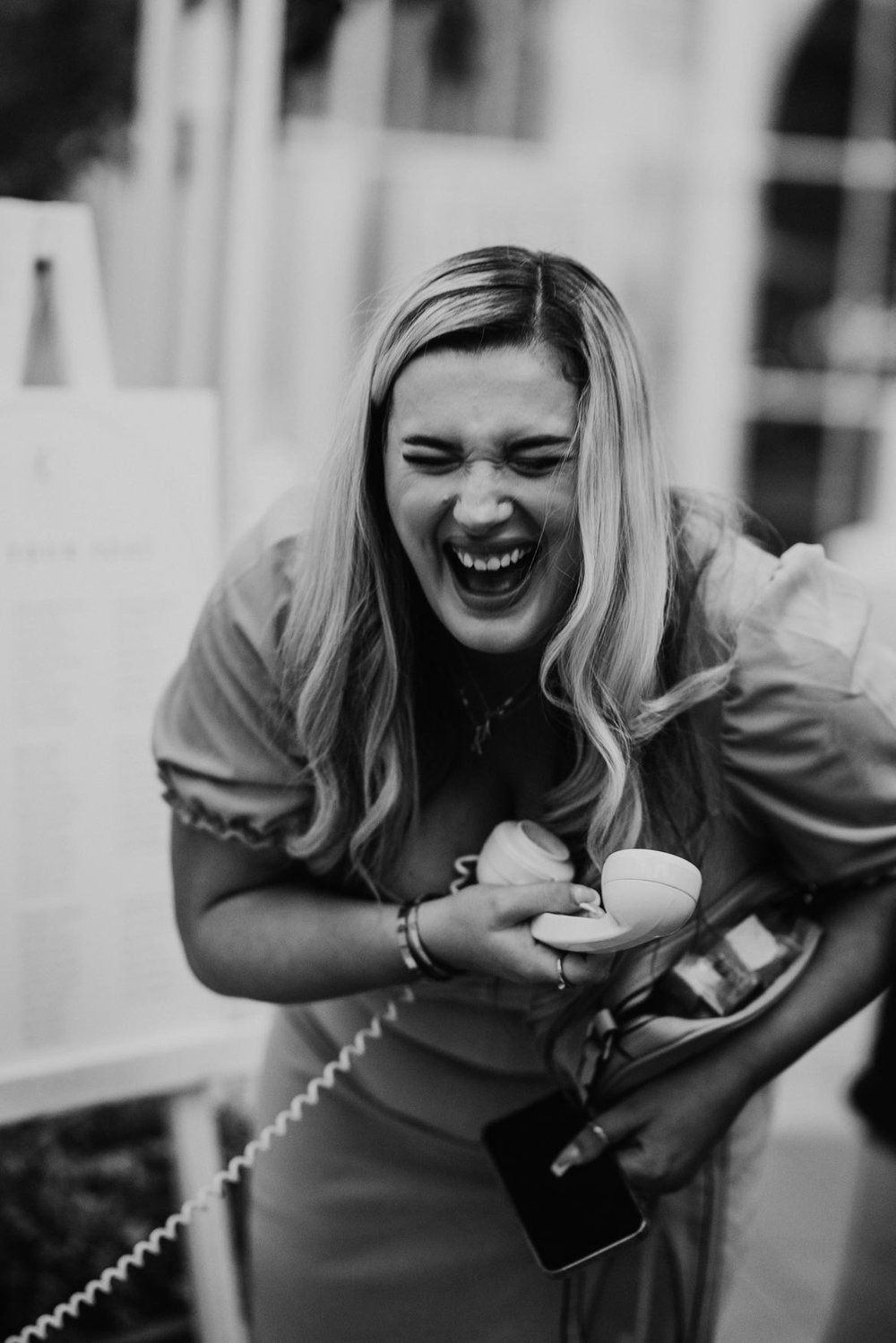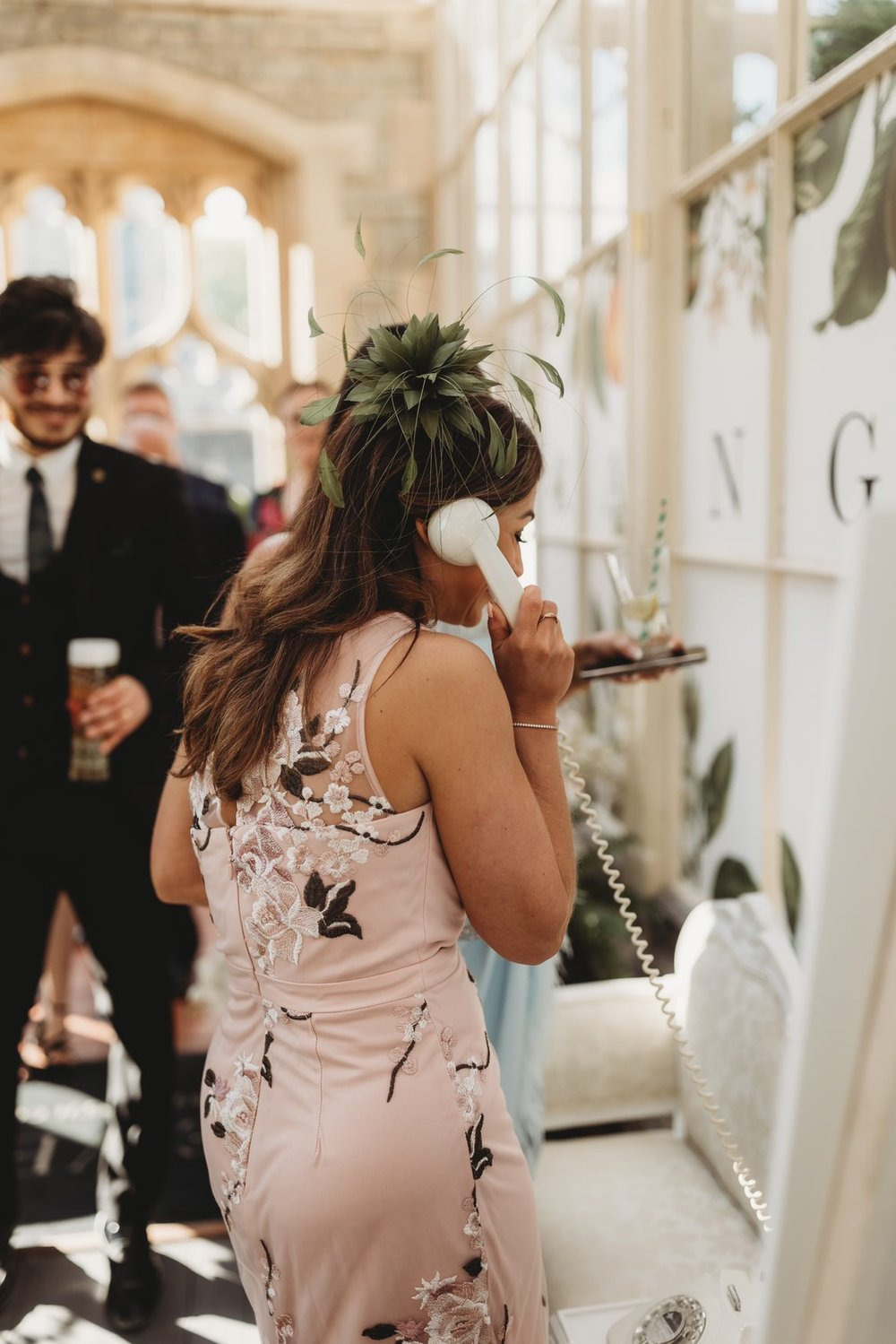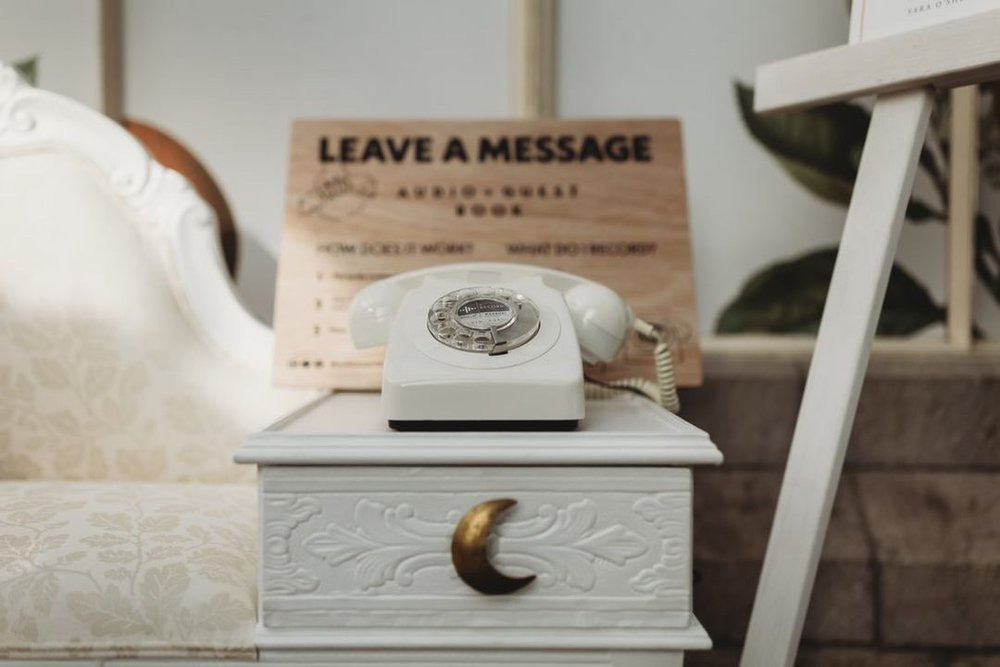 Os convidados pegam no telefone ouvem a sua mensagem personalizada e pré-gravada .